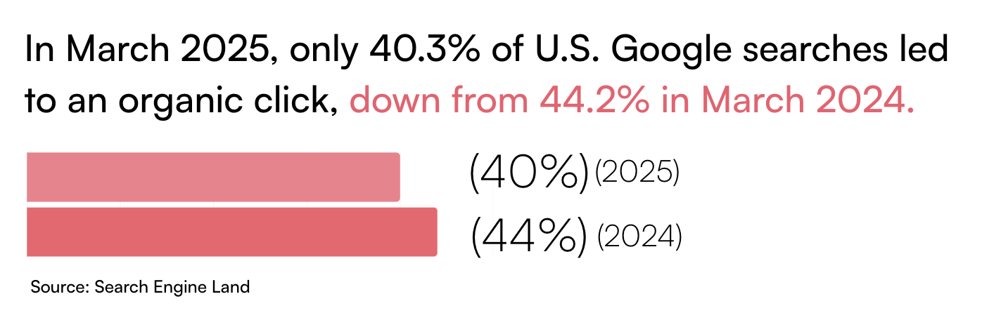 The numbers tell the story. In March 2025, only 40.3% of U.S. Google searches led to an organic click, down from 44.2% in March 2024. In the EU and UK, the share fell from about 47.1% to 43.5% over the same span. In parallel, more of the remaining clicks moved to Google-owned destinations like YouTube and Maps. A 2024 study found that for every 1,000 U.S. searches, only about 360 clicks reached the open web. In the EU, the figure was about 3741. AI Overviews appeared on roughly 13% of queries in March 2025, which further concentrates attention at the top of the page.2