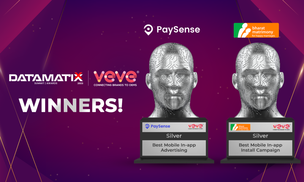 Mumbai, August 17, 2023: VEVE secured two silver accolades at the prestigious Adgully DATAMATIXX Awards 2023 for their exceptional on-device (mobile) advertising campaigns with popular brands, Paysense and Bharat Matrimony. The awards celebrate top-notch marketing initiatives, including the best digital and tech-driven campaigns by marketers and leading agencies.